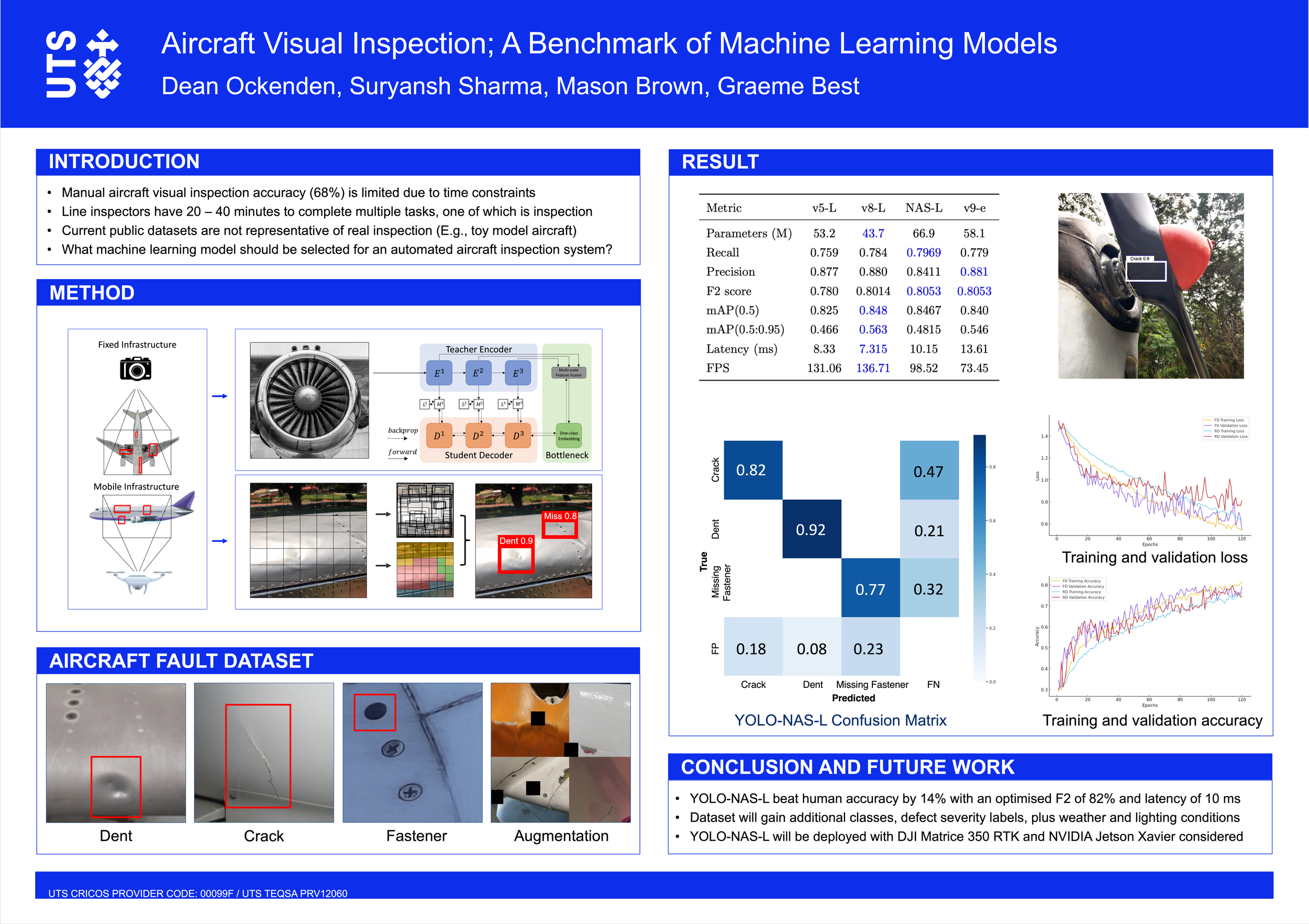 Aircraft inspection benchmarks supervised and unsupervised models for fault detection. A custom aircraft defect dataset was developed. YOLO-NAS-L achieved an F2 score of 0.82, improving human accuracy by 14%. Unsupervised models reached ~80% accuracy on a public defect dataset.